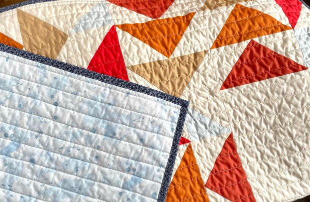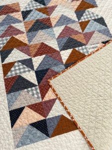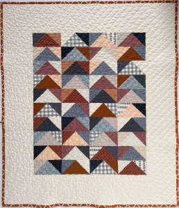 This baby quilt features a design with an array of 40 flying geese, pieced in various woven fabrics. The colour scheme has complementary blues and oranges in muted, earthy tones, paired with “natural” cotton for the border. I love the softness that unbleached natural cotton brings with the little flecks adding lots of interest. The backing is a neutral repeating block print (also on an unbleached cotton base). A burnt orange binding is machine finished, and 1″ diagonal quilting lines give lots of that lovely crinkle and keep the drape of the quilt nice and soft.