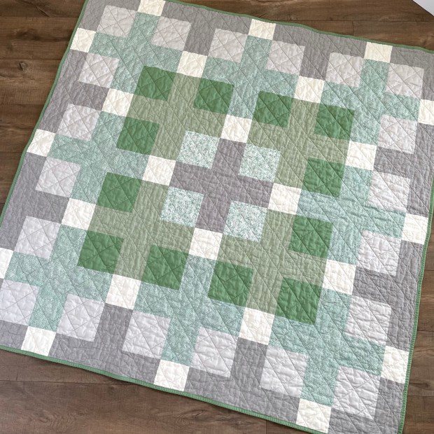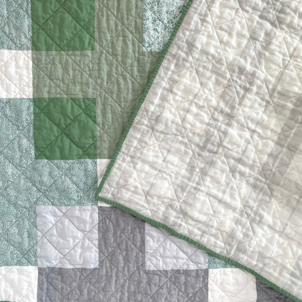 Solid and print fabrics, flannel backing, thread, and batting are all 100% cotton; Essex yarn-dyed fabrics in steel grey and light green on the front of the quilt are 55% linen/45% cotton blends.